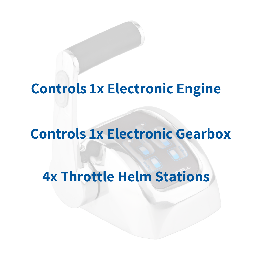 This system controls 1x Electronic Engine and 1x Electronic Gearbox. It connects via CANBus to 4x Flexball 4500 Single Throttle Station.